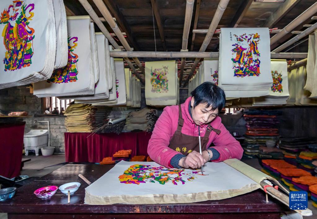 春節臨近,湖南省邵陽(yáng)市隆回縣灘頭鎮的木版年畫(huà)作坊加班加點(diǎn)趕制年畫(huà),供應春節市場(chǎng)。
