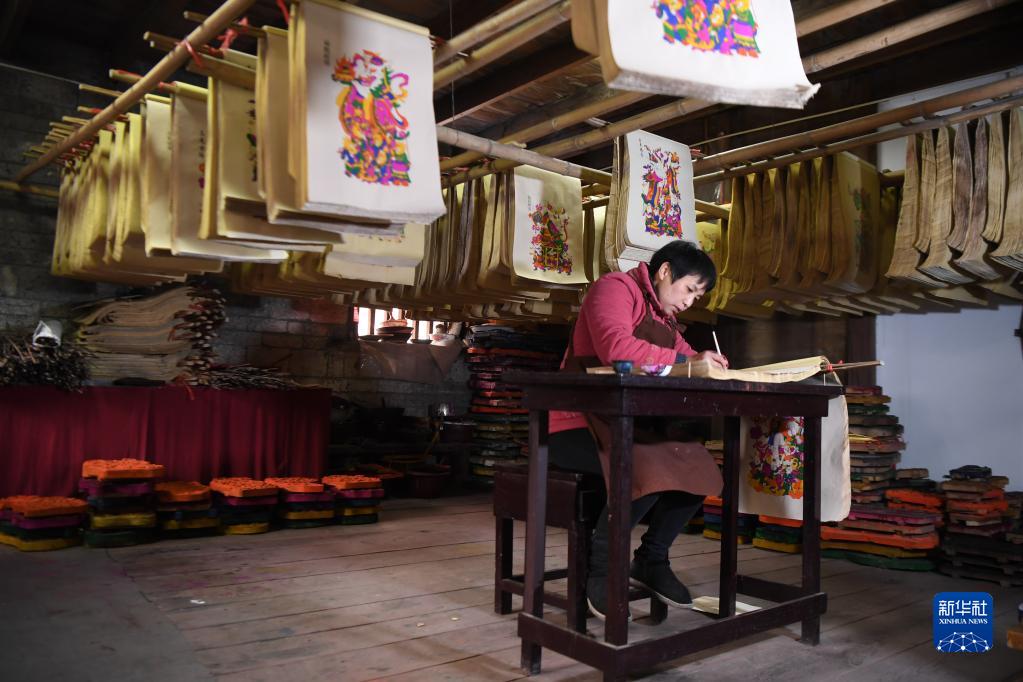 春節臨近,湖南省邵陽(yáng)市隆回縣灘頭鎮的木版年畫(huà)作坊加班加點(diǎn)趕制年畫(huà),供應春節市場(chǎng)。