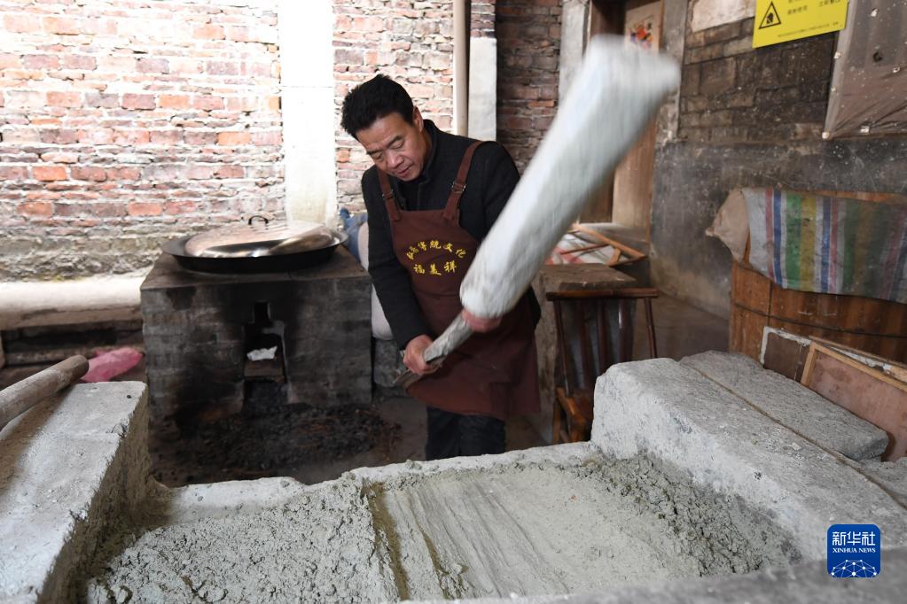 1月17日,在灘頭鎮福美祥年畫(huà)作坊,工人在加工天應石備用。天應石加工成的漿刷在紙上能使年畫(huà)上色更加艷麗。
