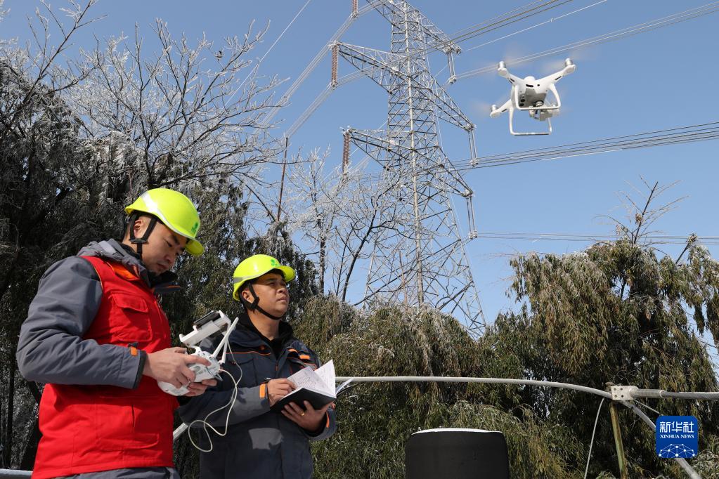 1月16日,在銅陵市義安區天門(mén)鎮,國網(wǎng)安徽省電力公司運維人員操作無(wú)人機觀(guān)測輸電線(xiàn)路覆冰情況。