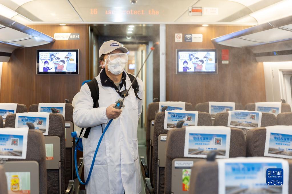 春運期間,上海華鐵旅客服務(wù)有限公司工作人員對入庫終到上海動(dòng)車(chē)段虹橋動(dòng)車(chē)運用所的動(dòng)車(chē)組列車(chē)開(kāi)展消毒清潔作業(yè),守護平安健康春運。