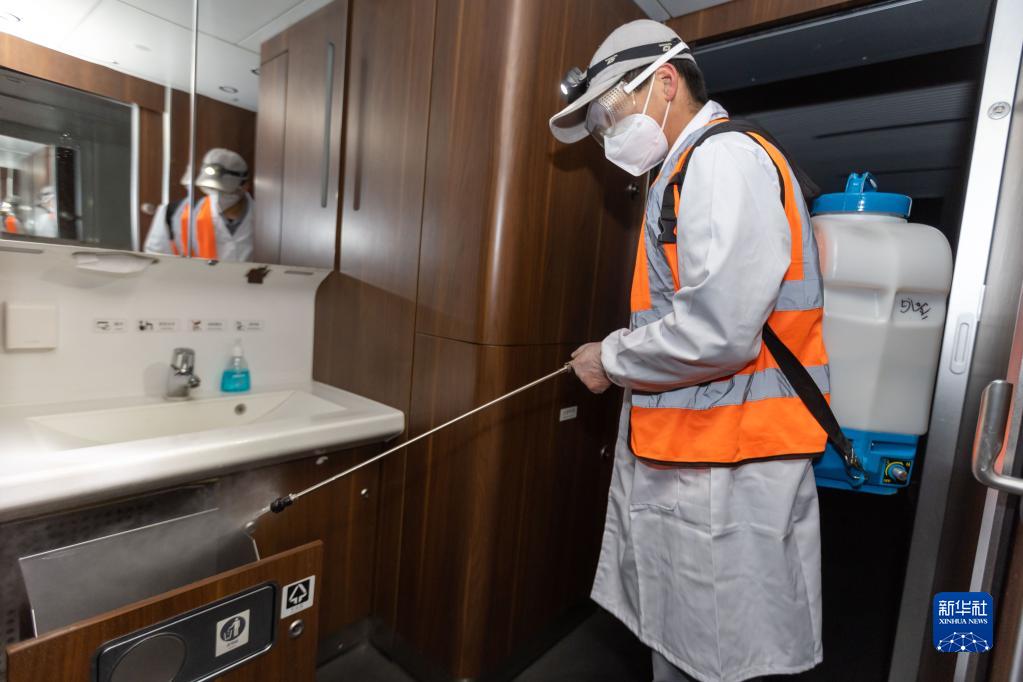 春運期間,上海華鐵旅客服務(wù)有限公司工作人員對入庫終到上海動(dòng)車(chē)段虹橋動(dòng)車(chē)運用所的動(dòng)車(chē)組列車(chē)開(kāi)展消毒清潔作業(yè),守護平安健康春運。