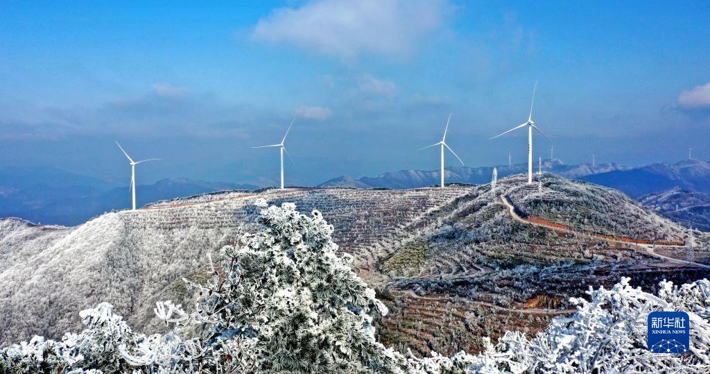 1月16日,浙江省金華市磐安縣一風(fēng)電場(chǎng)雪后初霽(無(wú)人機照片)。