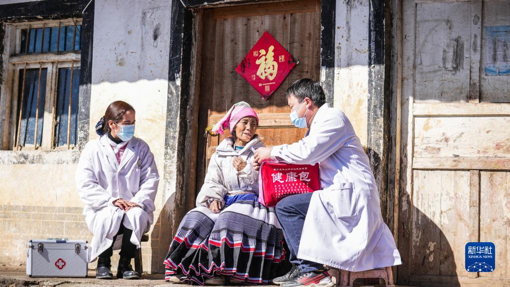 醫務(wù)工作者到六盤(pán)水市鐘山區金盆苗族彝族鄉雙塘村村民家中巡診送藥(1月6日攝)。