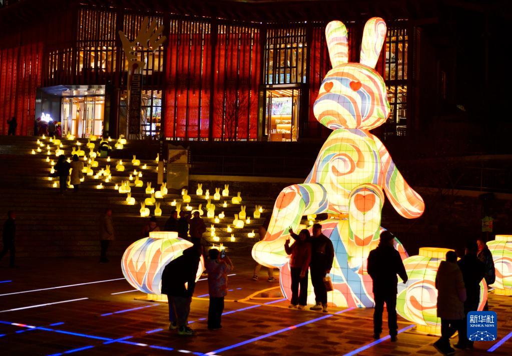1月17日晚,人們在湖北省宣恩縣城興隆老街觀(guān)看兔元素彩燈。