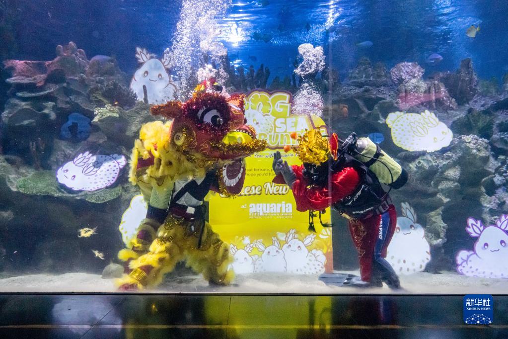 1月18日,潛水員在馬來(lái)西亞吉隆坡城中城水族館進(jìn)行水中舞獅和“財神”拜年表演。