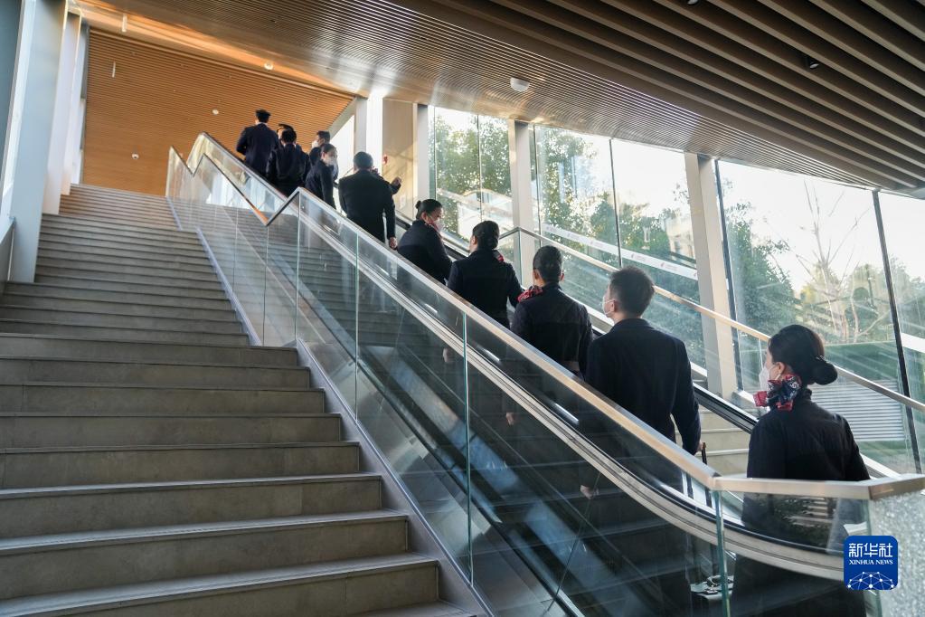 機組人員在東航的工作區內乘電梯準備登機(1月9日攝)。