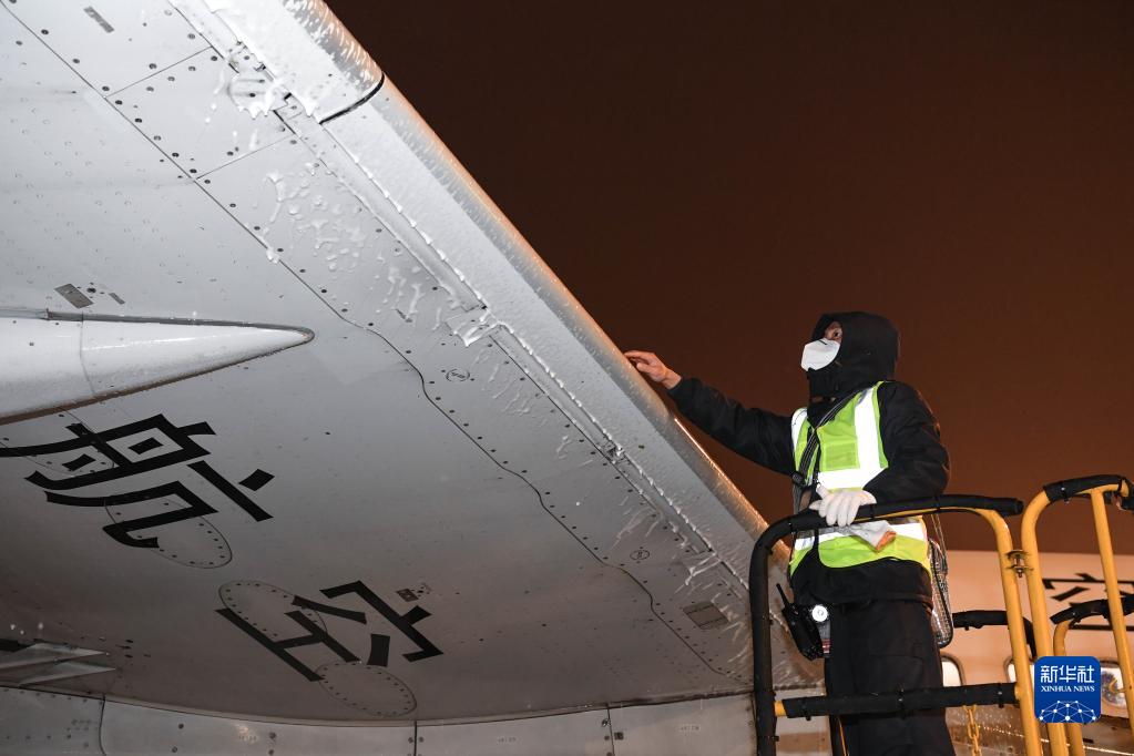 1月17日晚,在貴陽(yáng)龍洞堡國際機場(chǎng),南方航空的機務(wù)人員對飛機除冰情況進(jìn)行檢查。