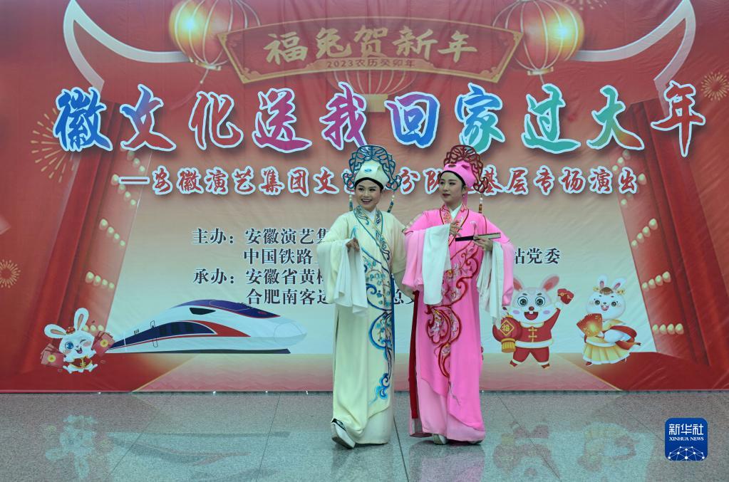 當日,一場(chǎng)“徽文化送我回家過(guò)大年”活動(dòng)在合肥南站舉行,安徽省黃梅戲劇院多位演員在候車(chē)大廳內為旅客帶來(lái)精彩的黃梅戲演出,營(yíng)造濃厚的春節氛圍,讓廣大旅客回鄉路上體驗濃濃“年味”。