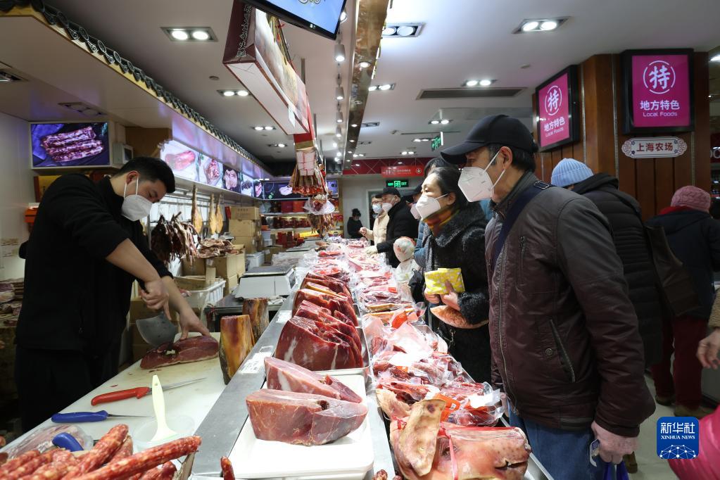 1月18日,顧客在上海市南京路步行街上的一家食品店內購買(mǎi)年貨。