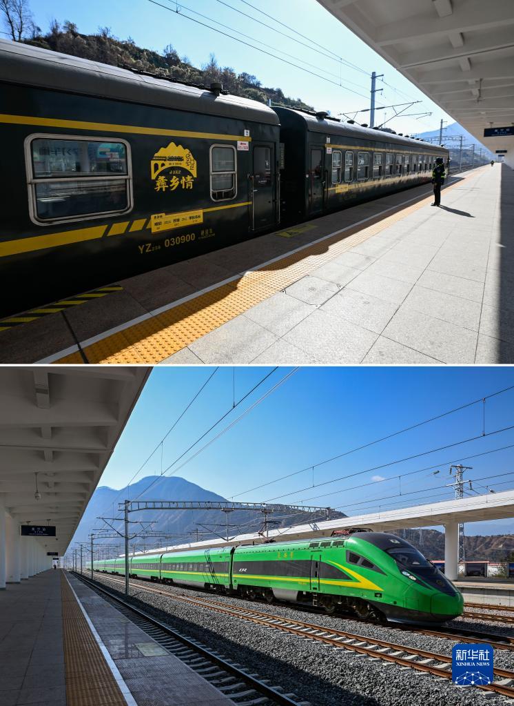 拼版照片:上圖是1月16日,攀枝花開(kāi)往普雄的5634次“慢火車(chē)”駛過(guò)冕寧站;下圖是1月16日,一列“復興號”動(dòng)車(chē)組駛過(guò)冕寧站。
