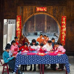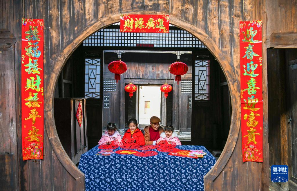 1月18日,在常寧市廟前鎮中田古村,常寧市剪紙非遺傳承人指導小朋友們練剪“廉”字、“?!弊?。