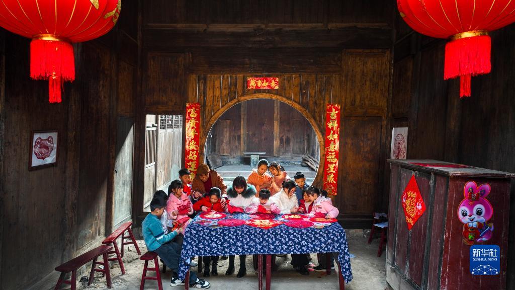 1月18日,在常寧市廟前鎮中田古村,常寧市剪紙非遺傳承人指導小朋友們練剪“廉”字、“?!弊?。