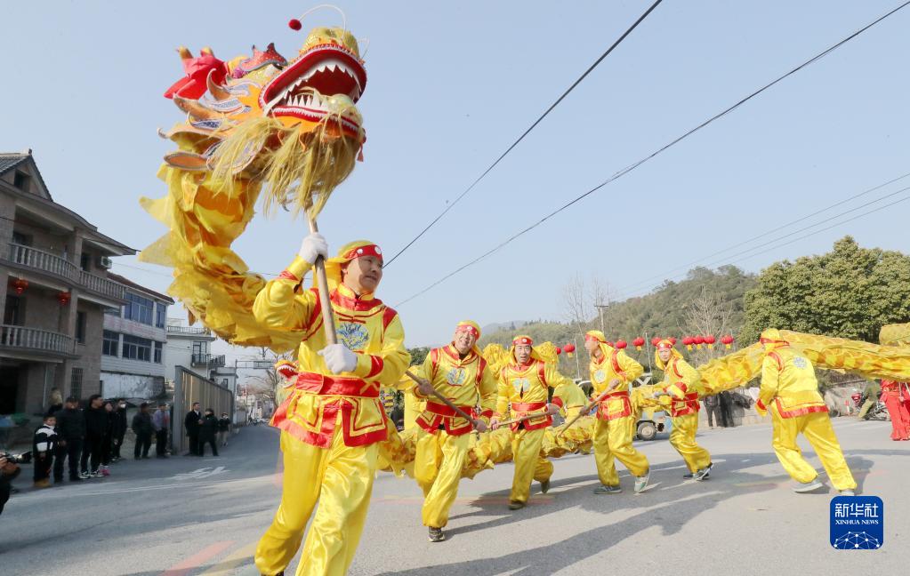 1月19日,浙江省湖州市德清縣莫干山鎮的村民在表演舞龍。