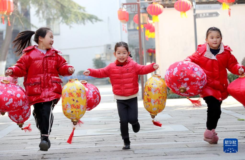 1月18日,在浙江省湖州市德清縣乾元古城弄堂里,小朋友們手提燈籠參加“古城非遺趕大集”活動(dòng)。