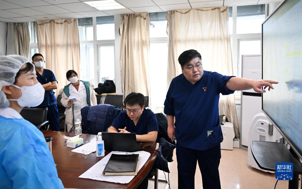劉洋(右)在天津醫科大學(xué)總醫院主持急診分流救治專(zhuān)班調度會(huì )(1月17日攝)。