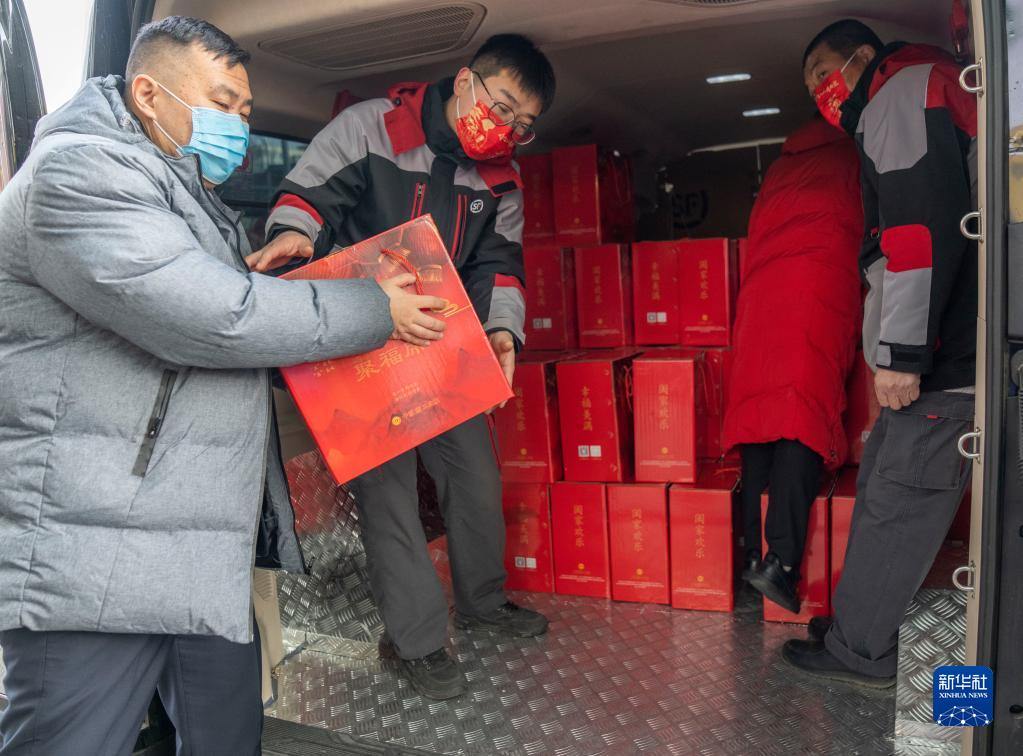 1月19日,工作人員在北京中國職工之家搬運年夜飯預制品禮包。