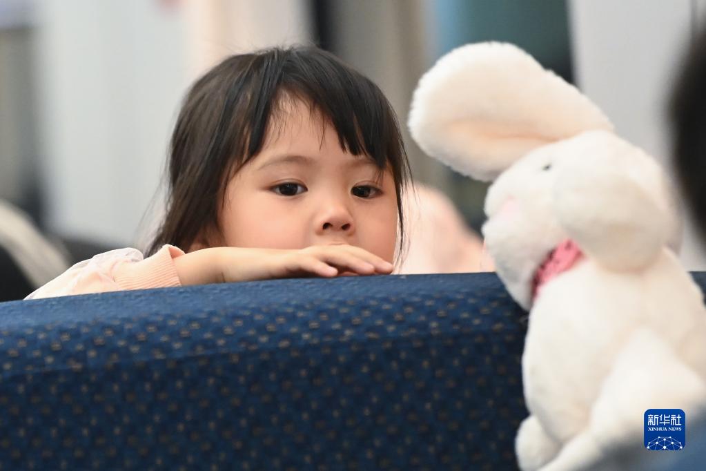 一名小女孩拿著(zhù)兔子玩偶在D2246/D2247次列車(chē)上玩耍(1月18日攝)。