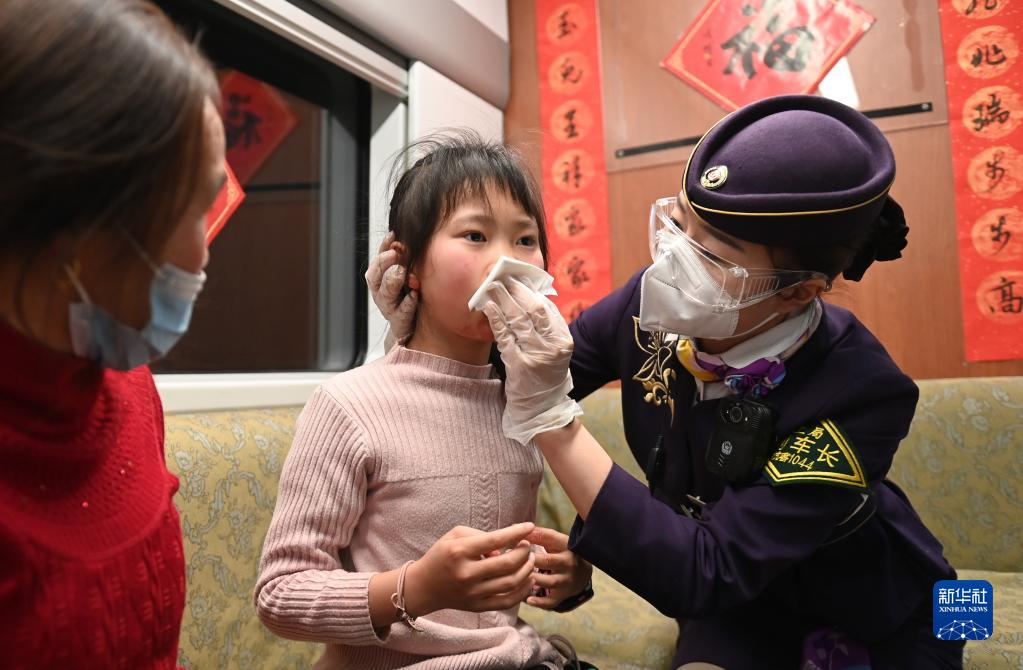 杭州客運段高鐵四車(chē)隊列車(chē)長(cháng)劉娟萍(右)在D2246/D2247次列車(chē)上為一位流鼻血的女孩做緊急處理(1月18日攝)。