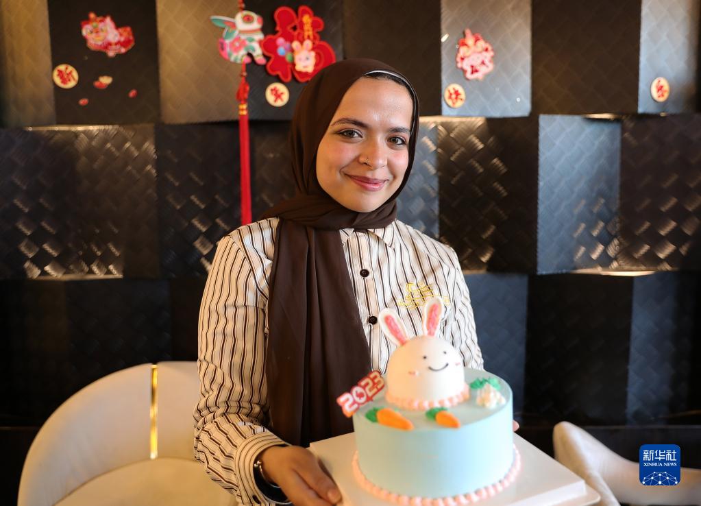 1月18日,一位店員在位于埃及首都開(kāi)羅的一家烘焙坊內展示兔年主題的蛋糕。臨近中國農歷春節,這家烘焙坊推出兔年春節主題裝飾與商品,增添節日氣氛、吸引消費者。
