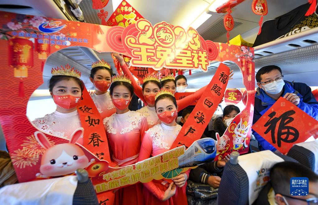 臨近春節,中國鐵路蘭州局集團有限公司銀川客運段將部分列車(chē)車(chē)廂裝扮一新,組織青年職工在列車(chē)上表演自編的節目,為旅客送上小禮物,讓人們將旅途中的歡樂(lè )帶回家。