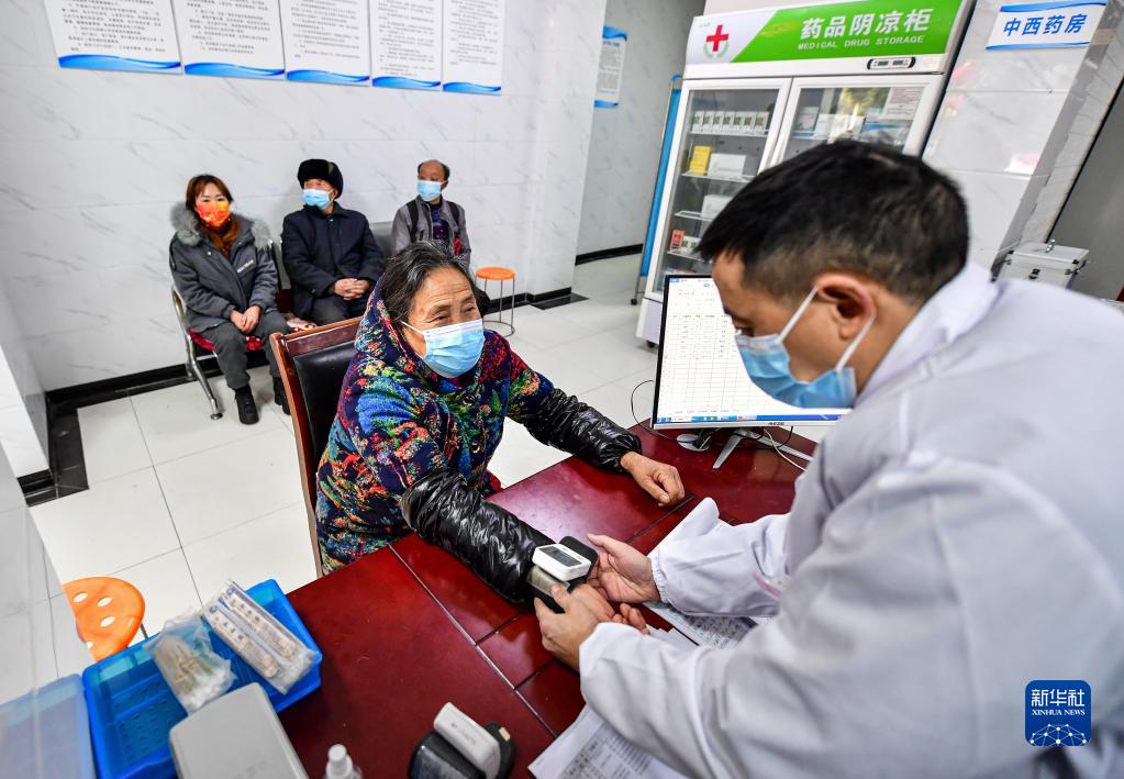 1月19日,北川縣曲山鎮任家坪村、石椅村聯(lián)合衛生室村醫趙太安(右一)在村衛生室為前來(lái)問(wèn)診的村民測量血壓。