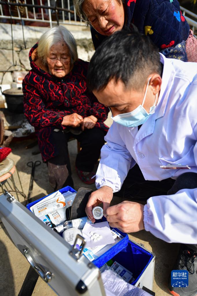 1月19日,在北川縣曲山鎮石椅村,入戶(hù)走訪(fǎng)的村醫趙太安現場(chǎng)為村民分包藥物。