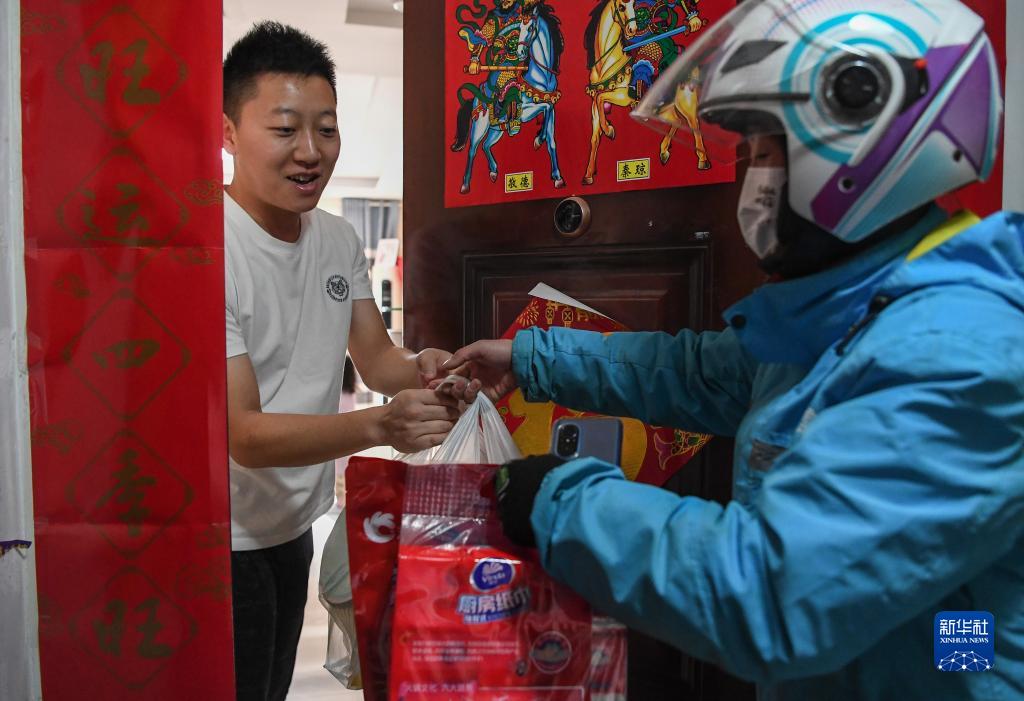 在西安市灞橋區一小區內,李文(右)將商品遞給顧客(1月18日攝)。