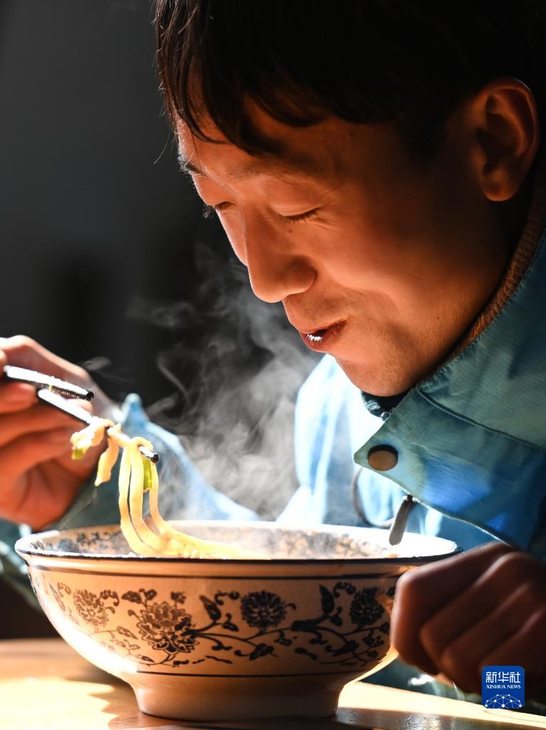 一上午忙碌過(guò)后,李文在西安市灞橋區一家面館吃午餐(1月18日攝)。