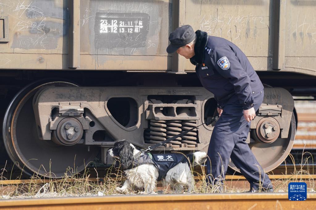 1月18日,民警王支斌和警犬“和平”在車(chē)站內巡邏。
