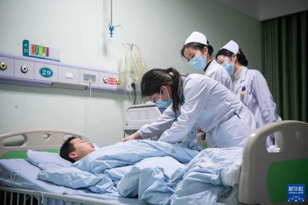 1月20日,醫護人員在夜間巡房中查看患兒病情。