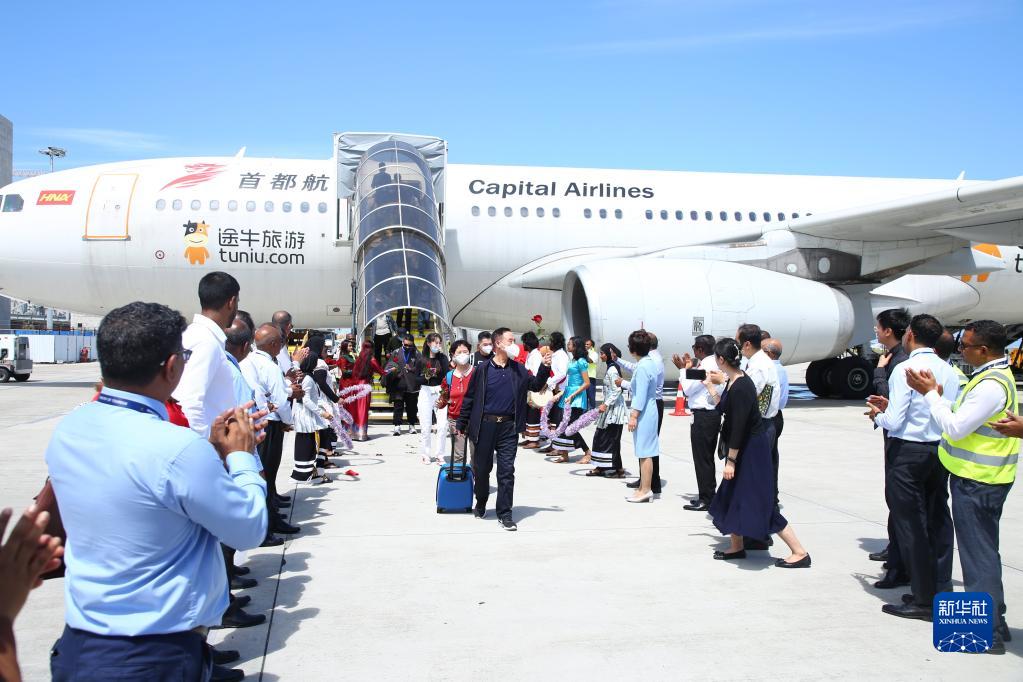 1月18日,乘坐中國首都航空JD455航班的游客在馬爾代夫馬累維拉納國際機場(chǎng)受到歡迎。