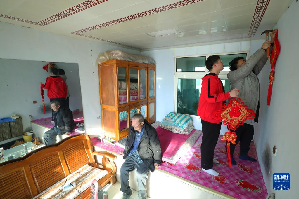 1月20日,沈陽(yáng)工學(xué)院老師和李天騏(右二)一起掛中國結。