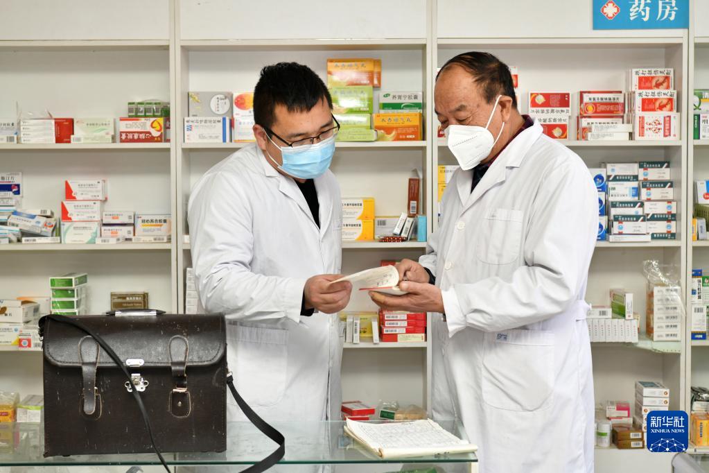 1月20日,南紅星(右)和兒子南洋陽(yáng)在村衛生室內交流當天診治分工事宜。