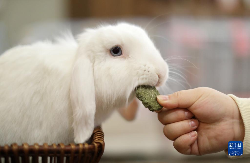 1月20日,沈陽(yáng)一家兔咖寵物體驗店里的寵物兔在吃草餅。