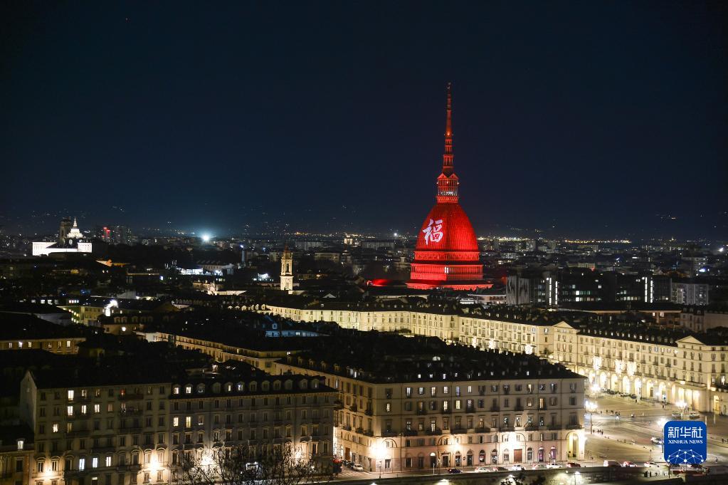 1月21日晚,意大利都靈的地標性建筑安托內利尖塔點(diǎn)亮“中國紅”和“?!?字,慶祝中國春節。