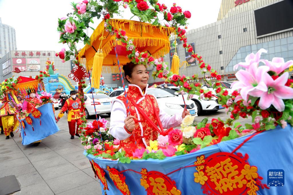 1月22日,民間藝人在江蘇省連云港市連云區表演“劃旱船”。