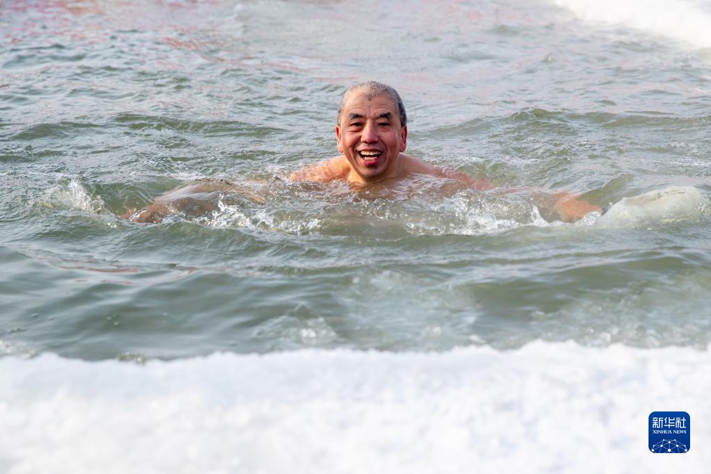1月22日,在黑龍江省哈爾濱市,冬泳愛(ài)好者在松花江中暢游。