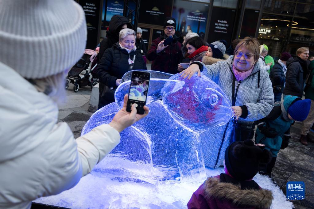 1月21日,人們在芬蘭赫爾辛基市中心與兔子冰雕拍照留念。