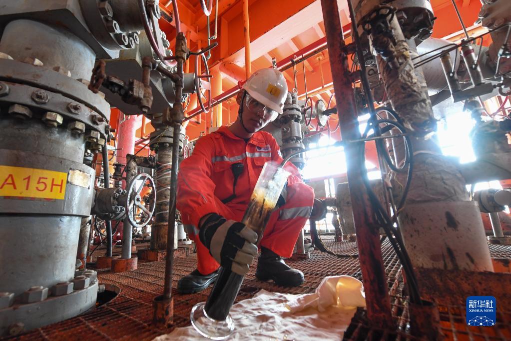 1月20日,一名石油工作者在平臺26米井口采油樹(shù)取油樣,準備檢測油中含水量。