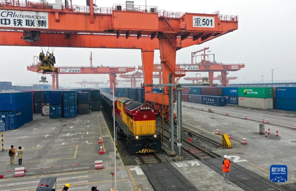 1月22日,兔年首趟西部陸海新通道鐵海聯(lián)運班列在重慶團結村中心站等待發(fā)車(chē)(無(wú)人機照片)。