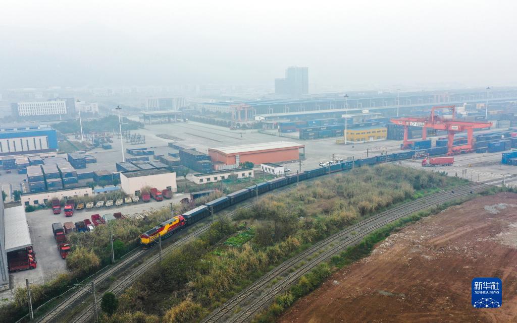 1月22日,兔年首趟西部陸海新通道鐵海聯(lián)運班列從重慶團結村中心站發(fā)車(chē)(無(wú)人機照片)。