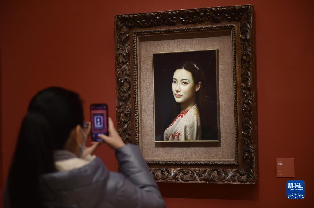 1月22日,參觀(guān)者在中國美術(shù)館拍攝“美在致廣——全國小幅美術(shù)精品展”中的展出作品《回眸》。