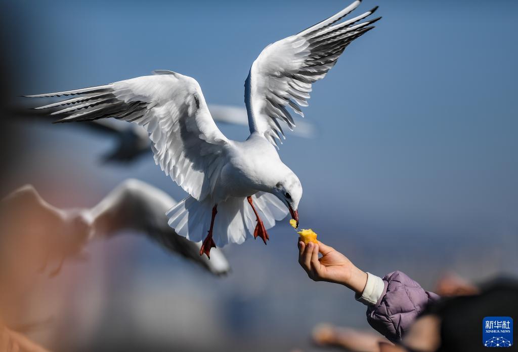 1月23日,游客在昆明市滇池海埂大壩上投喂紅嘴鷗。