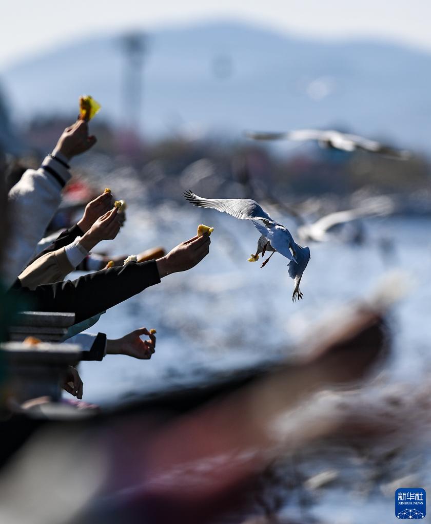 1月23日,游客在昆明市滇池海埂大壩上投喂紅嘴鷗。
