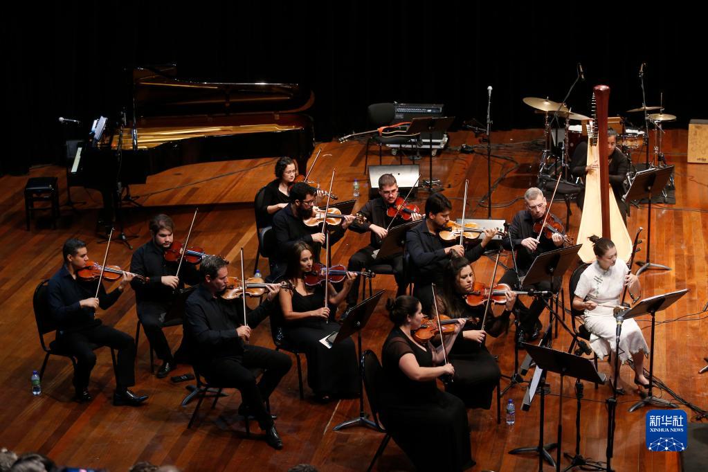 1月21日晚,在巴西首都巴西利亞普利尼奧·馬科斯劇院,中國民樂(lè )演奏家與巴西利亞室內樂(lè )團的音樂(lè )家們在2023年“歡樂(lè )春節”音樂(lè )會(huì )上演奏樂(lè )曲。