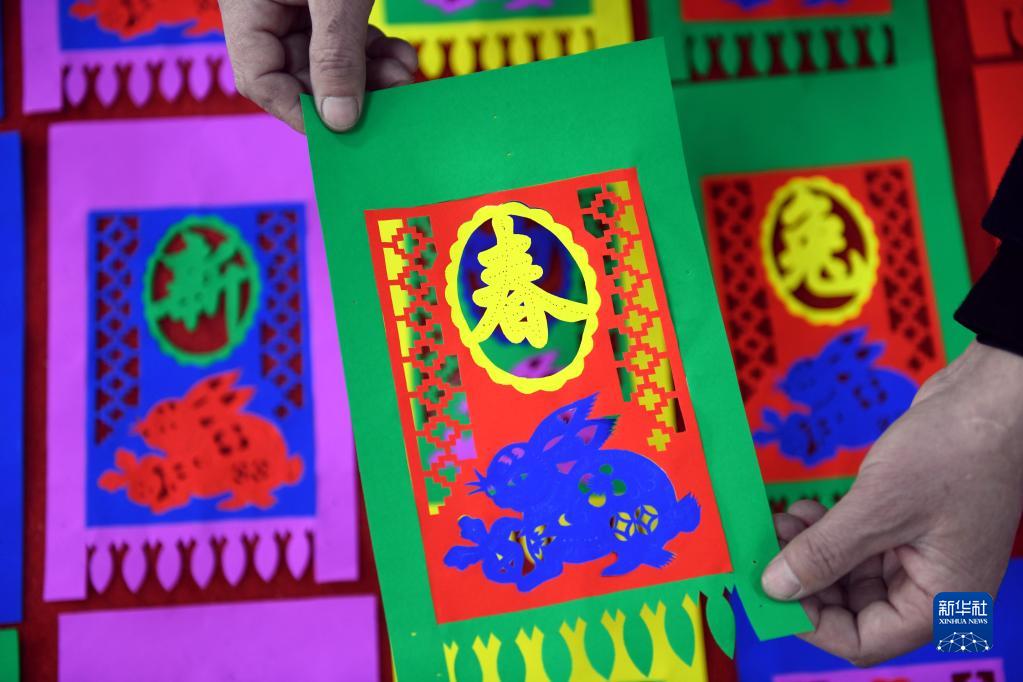 山東省臨沂市郯城縣馬頭鎮民間藝人張乃蒼展示制作的掛門(mén)箋“玉兔迎新春”(1月15日攝)。