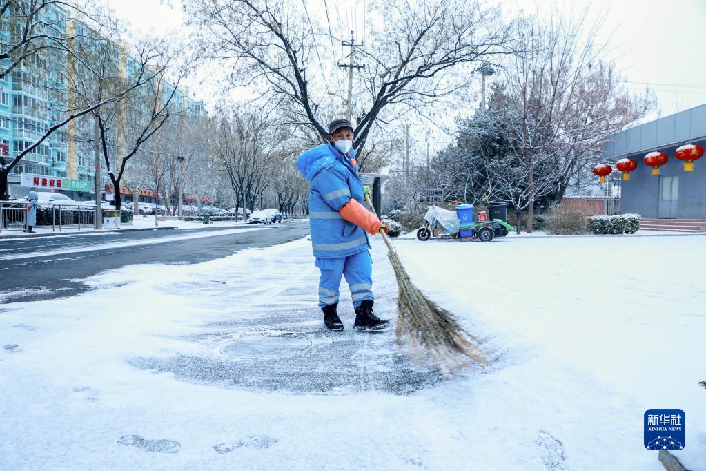 1月23日,北京環(huán)衛集團平谷公司道路清掃保潔員在北京市平谷區建設西街掃雪鏟冰。