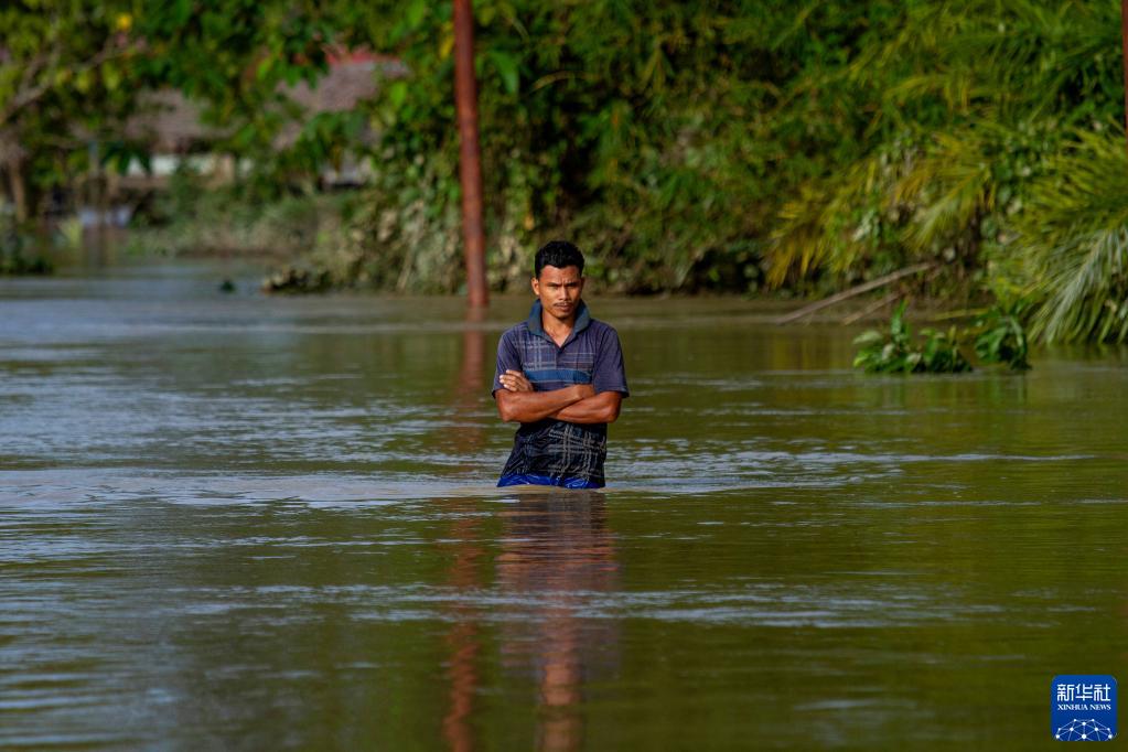 1月23日,在印度尼西亞亞齊特區北亞齊地區,一名男子在洪水中行走。