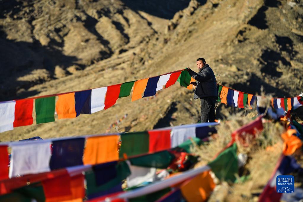 1月24日,日喀則市桑珠孜區的藏族群眾在山上懸掛五彩經(jīng)幡。